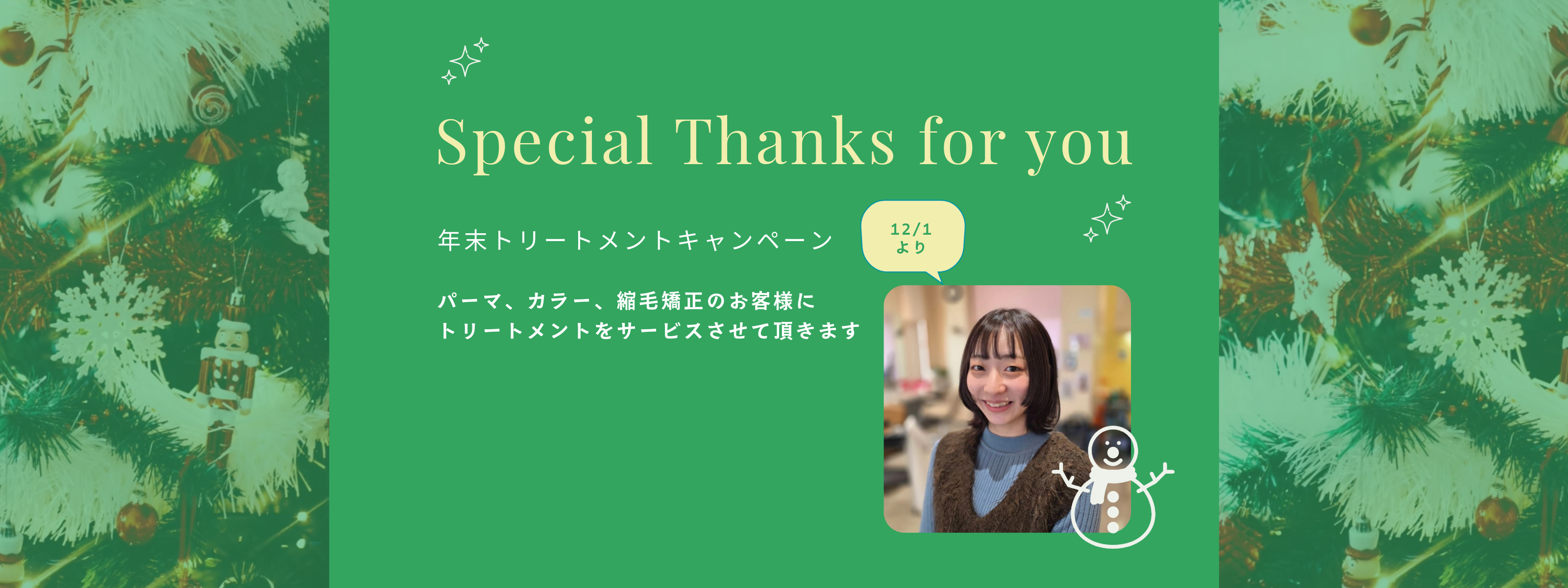 12月1日より、年末トリートメントキャンペーン! パーマ、カラー、マニキュア、縮毛矯正のお客様にトリートメントを サービスさせていただきます。