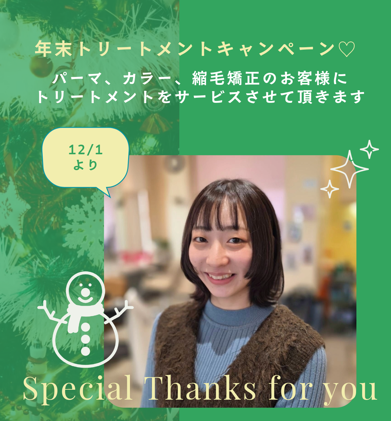 12月1日より、年末トリートメントキャンペーン! パーマ、カラー、マニキュア、縮毛矯正のお客様にトリートメントを サービスさせていただきます。
